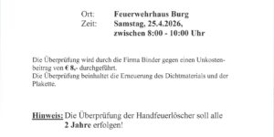 Am Samstag, dem 25.04.2026, findet in der Zeit von 08:00 bis 10:00 Uhr die Überprüfung der Handfeuerlöscher im Feuerwehr Haus Burg statt.