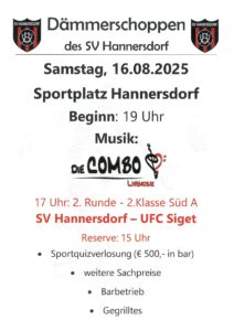 - Dämmerschoppen SV HannersdorfDer Sportverein Hannersdorf lädt herzlich zum Dämmerschoppen mit Live Musik am 16. August 2025 am Sportplatz ein und freut sich über zahlreiche Gäste! Davor findet das Meisterschaftsspiel gegen den UFC Siget statt.