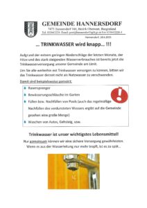 - …Trinkwasser wird knapp…!Aufgrund der extrem geringen Niederschläge der letzten Monate, der Hitze und des stark steigenden Wasserverbrauches ist bereits jetzt die Trinkwasserversorgung unserer Gemeinde am Limit. Um Sie alle weiterhin mit Trinkwasser versorgen zu können, bitten wir das Trinkwasser derzeit nicht als Nutzwasser zu verschwenden. Trinkwasser ist unser wichtigstes Lebensmittel! Nur gemeinsam können wir eine sichere Versorgung gewährleisten. Wenn es aus der Wasserleitung nur mehr tropft, ist es zu spät…